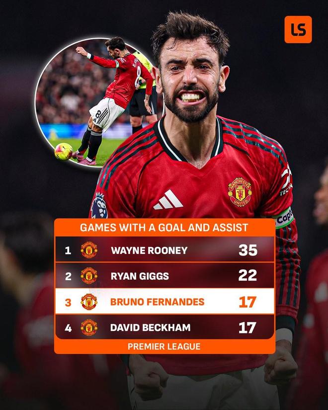 至此,布鲁诺-费尔南德斯曼联生涯已有17次英超单场既有进球又有助攻,这使得他追平贝克汉姆(17次),队史仅次于鲁尼(35次)和吉格斯(22次)。